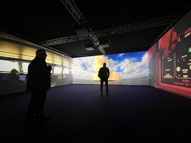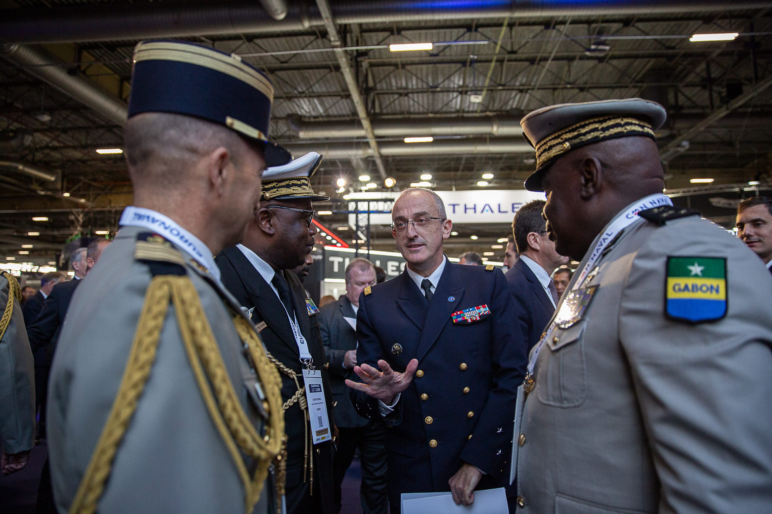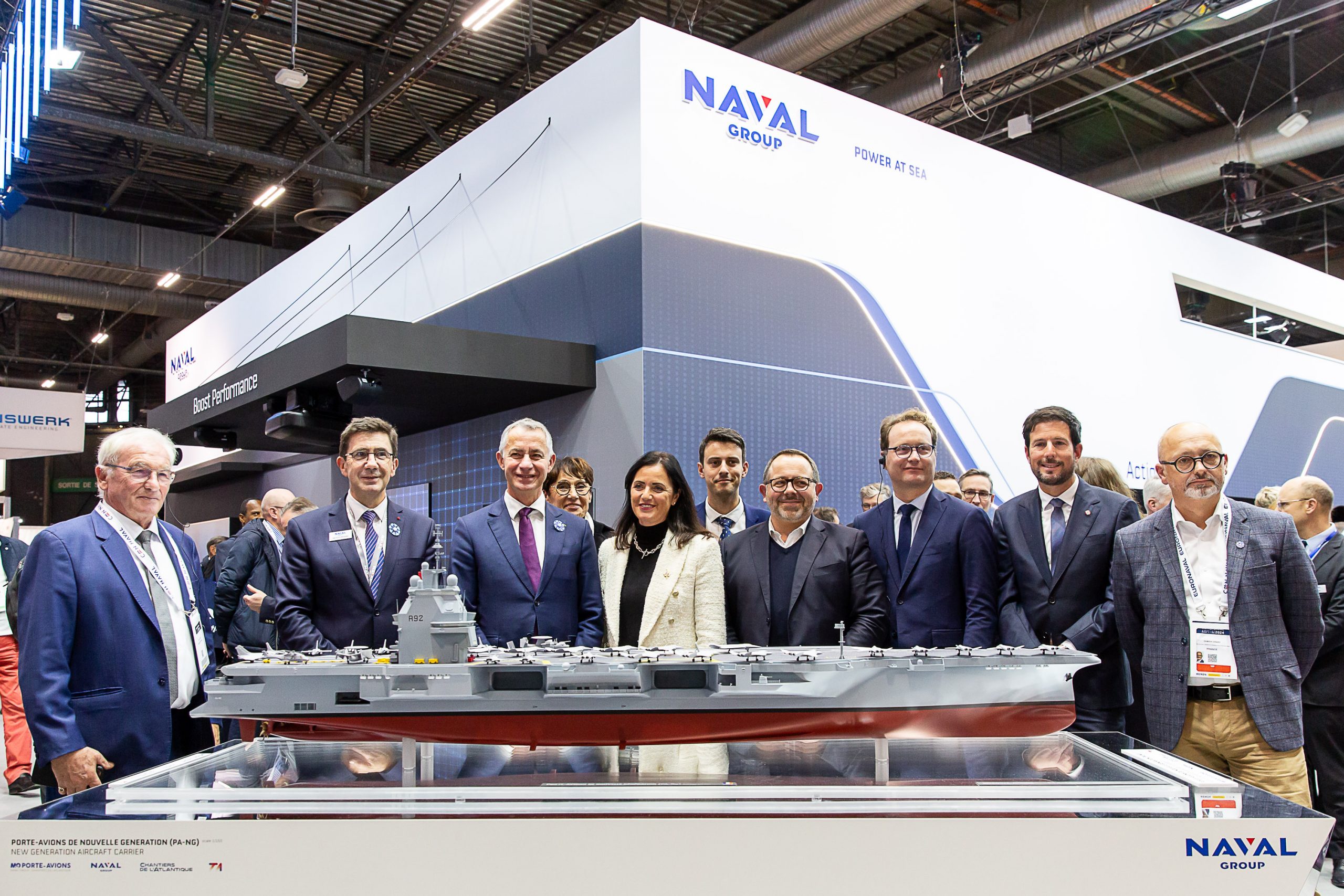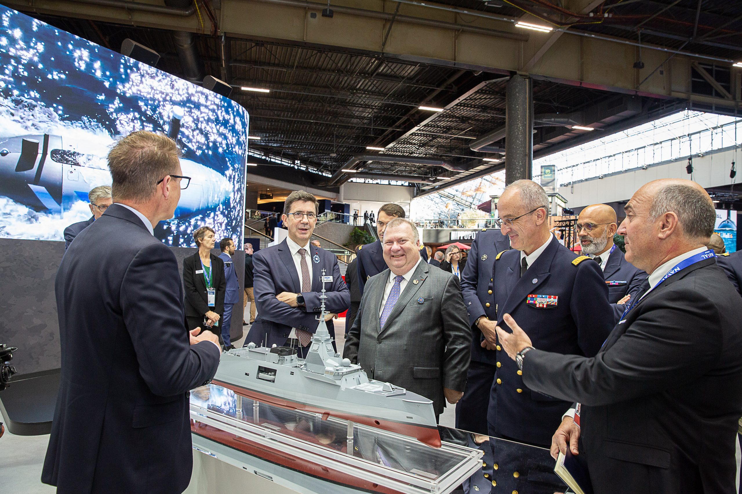 Mr Pierre-Eric Pommellet Mr Emmanuel Chiva and Admiral Nicolas Vaujour on the Naval Group stand