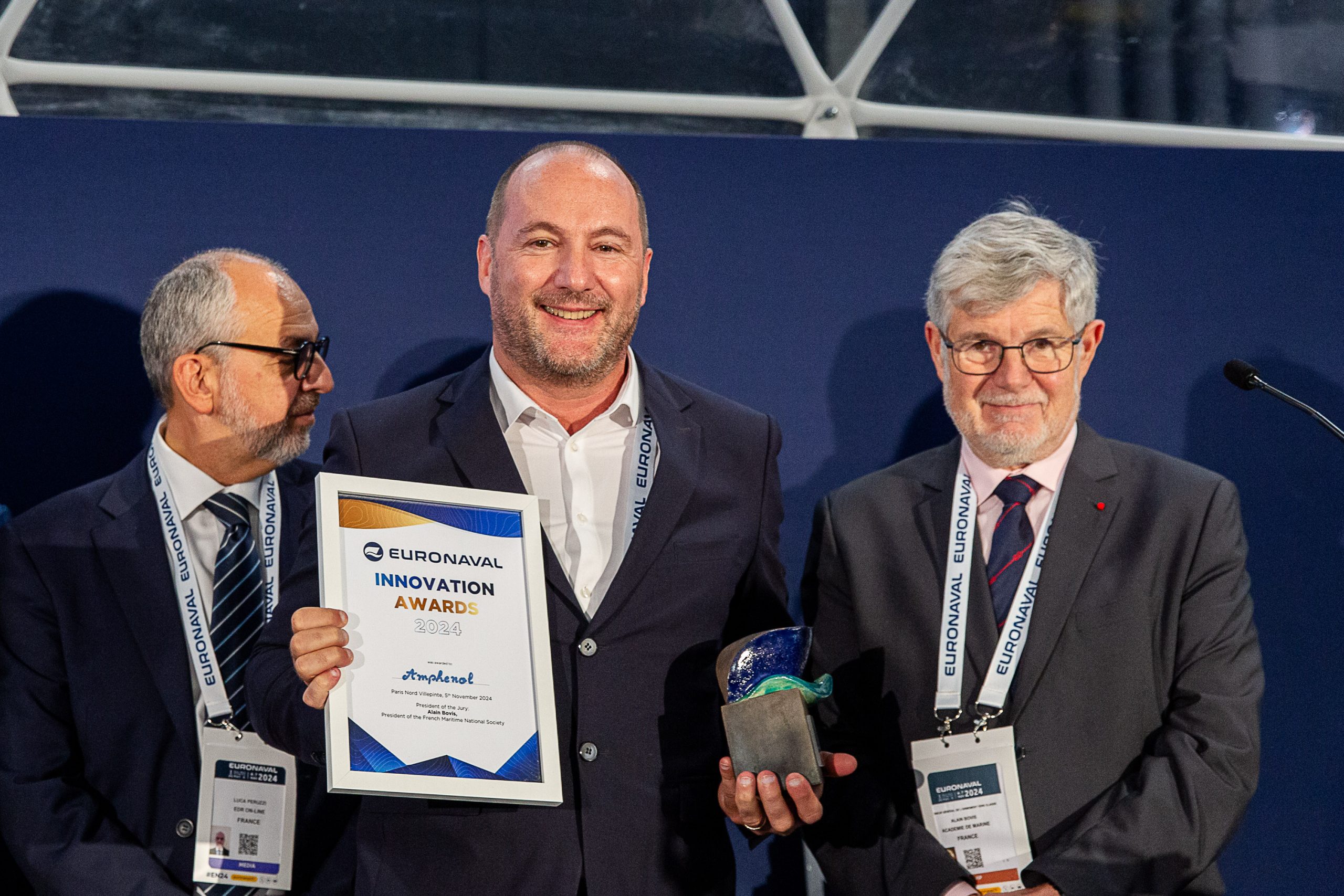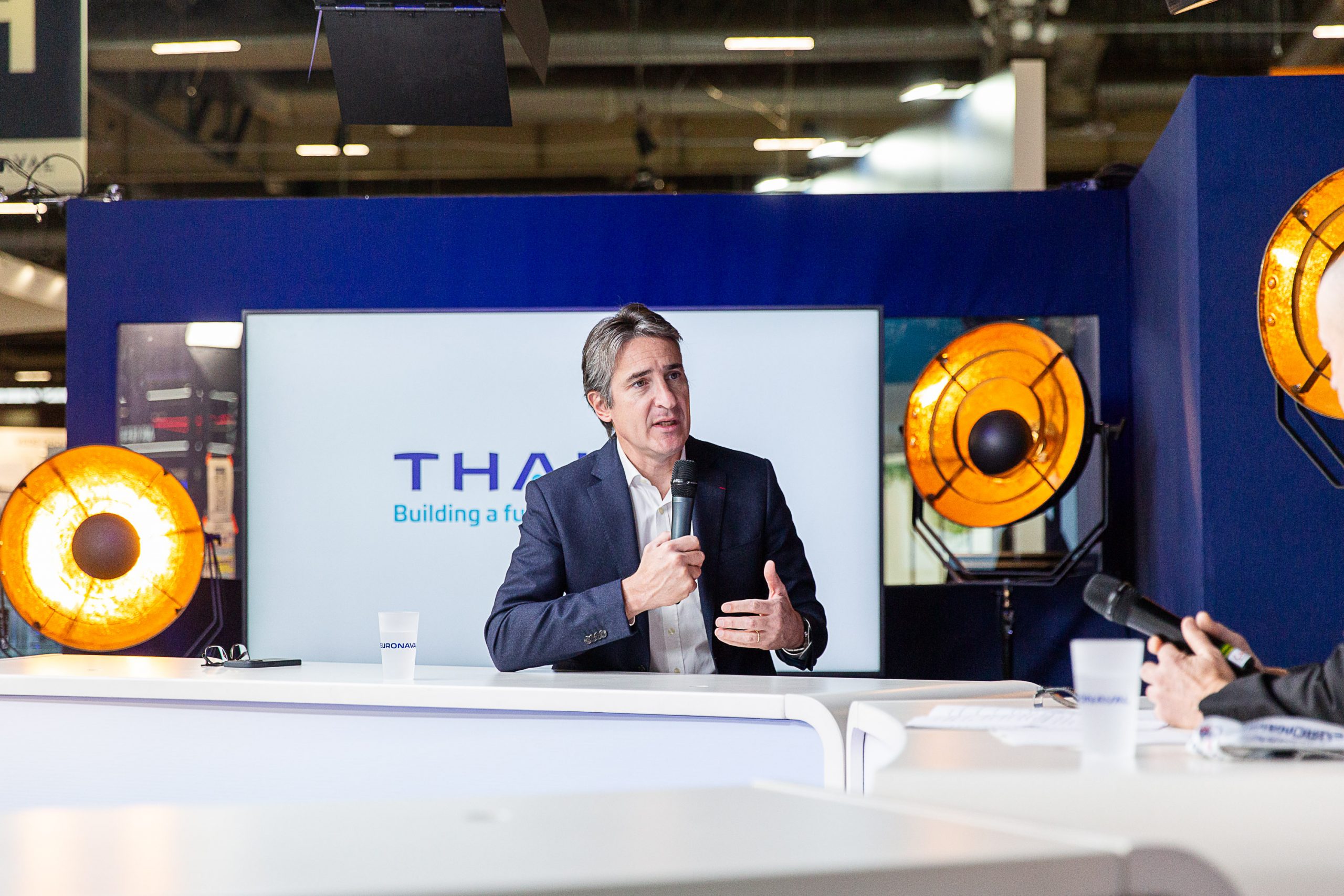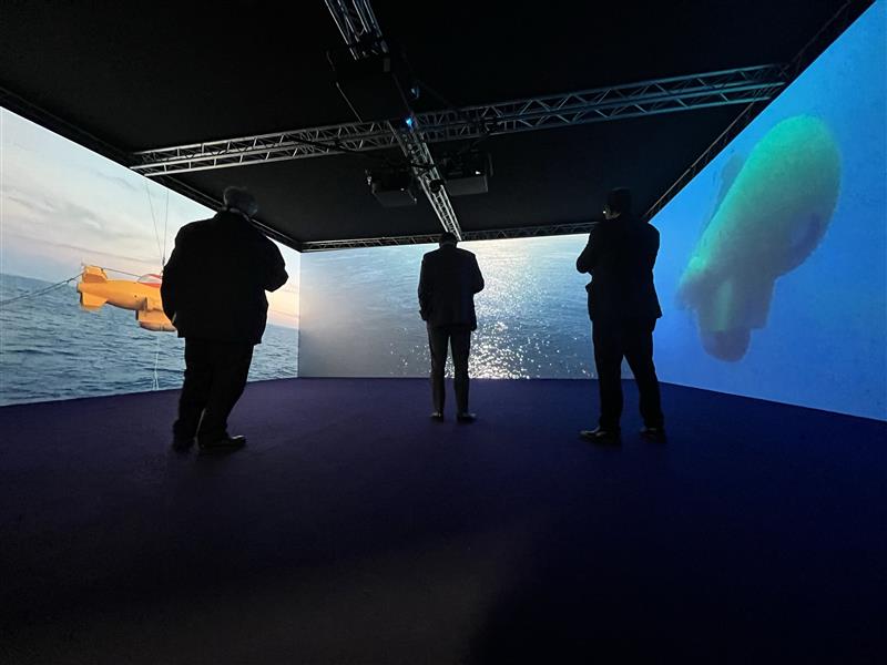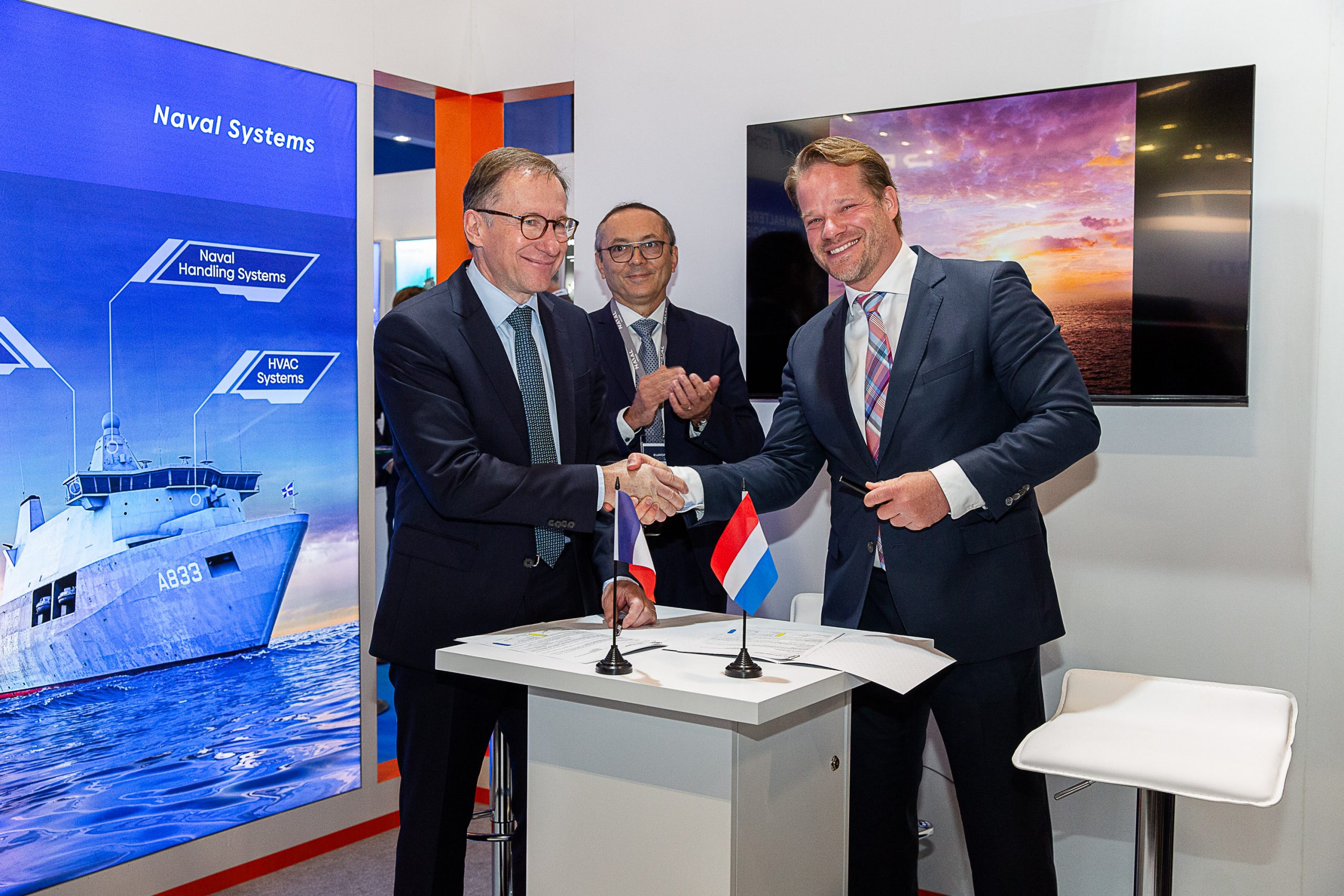 Mr Pierre-Eric Pommellet Mr Emmanuel Chiva and Admiral Nicolas Vaujour on the Naval Group stand