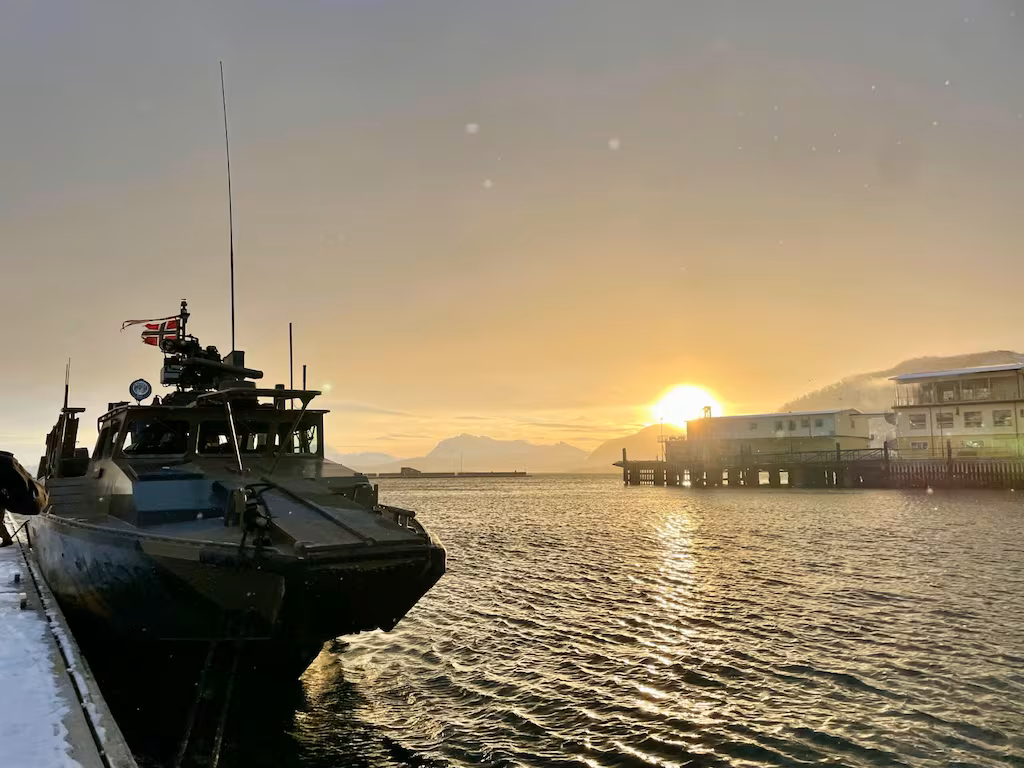 A Norwegian commando boat is docked near Harstad, Norway, during NATO exercise Joint Viking in March 2025.